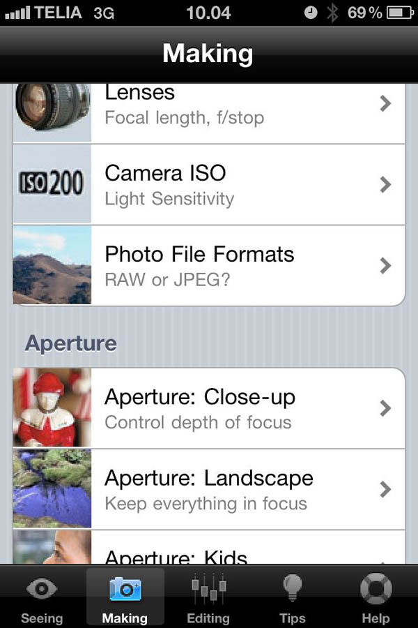 Når man kommer ind i programmet, så er der en liste‐oversigt, med forskellige emner. Nede i bunden, der er der så fire kategorier og en “hjælp” funktion.